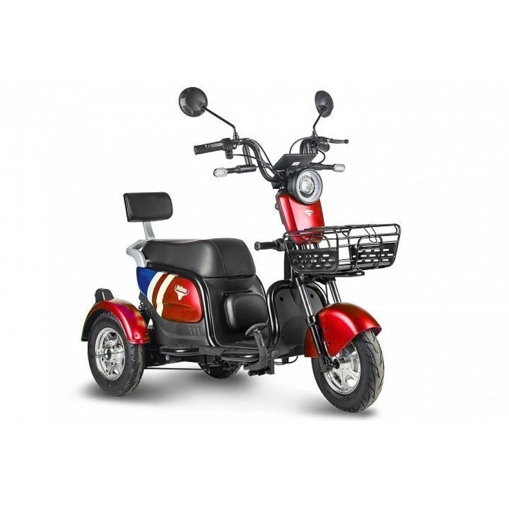 При визуальном знакомстве с техникой, первое, что привлекает внимание, современный дизайн и отсутствие наворотов. Трицикл оснащен светодиодной фарой, зеркалами, вместительной передней корзиной. Сиденье райдера широкое, изготовлено из мягкого материала, снижающего нагрузку на позвоночник. Под ним размещен бардачок, удобный для перевозки инструментов. Широкая платформа для ног не стесняет водителя, делает езду безопасной, минимизирует риск соскальзывания стоп. Техника рассчитана на двух ездоков. Пассажирское сиденье оснащено спинкой. При мощности двигателя 650 Вт трицикл способен выдавать скорость 25 км/час и преодолевать на одной подзарядке до 30 км пути (внимание, АКБ не входит в комплектацию).